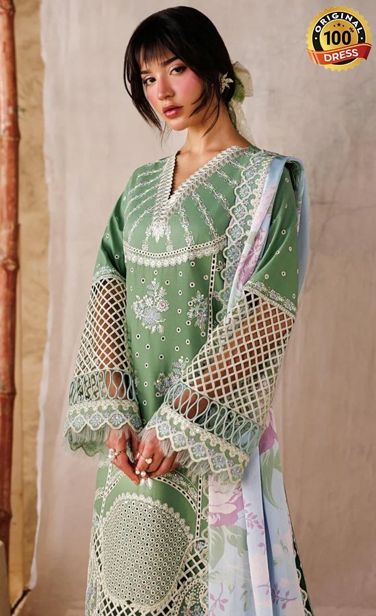Unveil the epitome of elegance and refinement with our Fresh Green ensemble from the “Chamak Damak” collection. Crafted to perfection, this ensemble boasts embroidered front and back panels accentuated by intricate navy blue threadwork and shimmering light gold sequins that dance gracefully across the fabric. The embroidered border and sleeves with borders add a touch of regal splendor to the attire while the embroidered chaak enhances its allure. Paired with a beautifully embroidered dupatta, this ensemble is a testament to unparalleled craftsmanship and exquisite design. Elevate your festive wardrobe with this resplendent piece that radiates timeless beauty and sophistication.