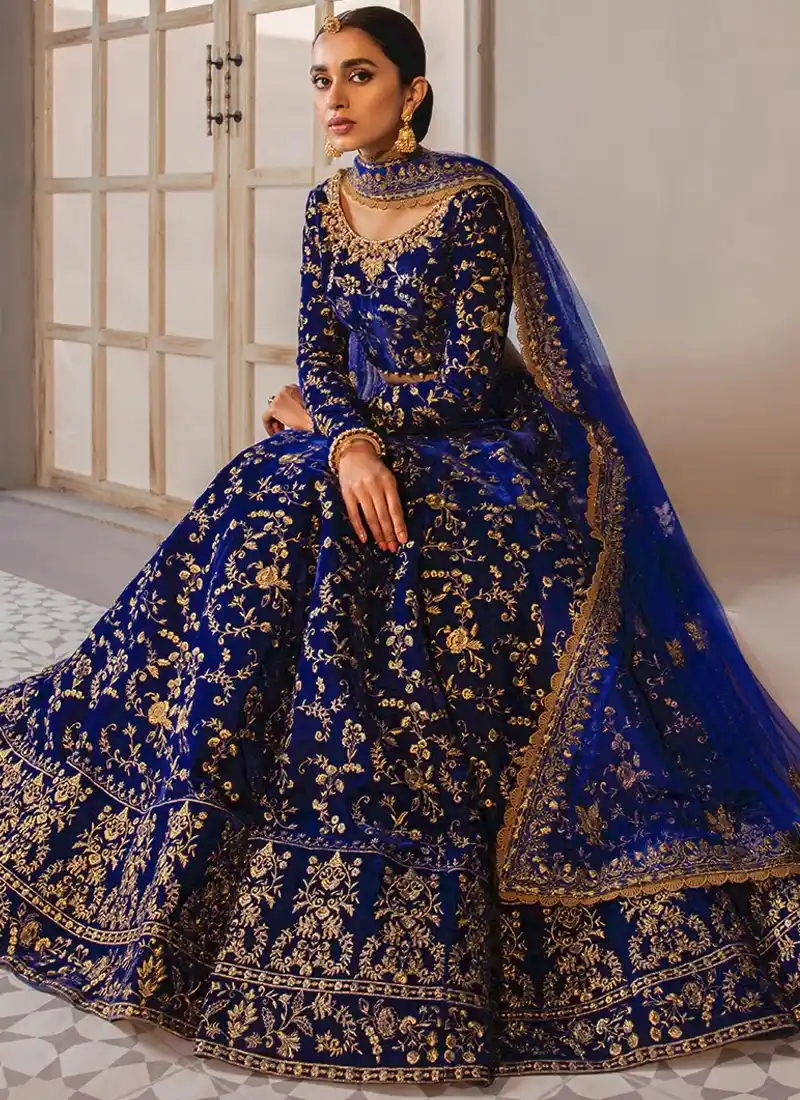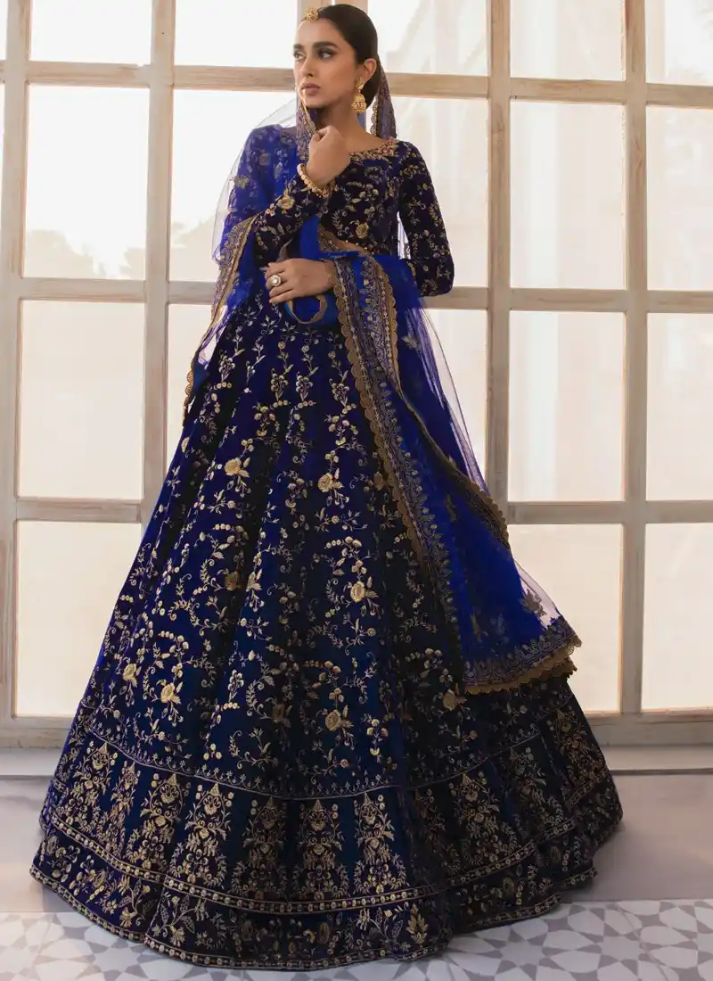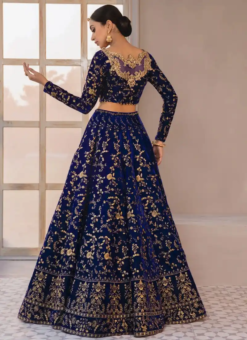 Bridal Book 2025-26 is an updated collection for Asian brides-to-be, created by our most talented artisans in the USA, featuring a cascade of captivating colour schemes, sumptuous fabrics, and sublime embroideries. Each Pakistani bridal outfit is more beautiful than the previous one. Check out our new Navy Blue Velvet Bridal Lehenga Choli – a perfect choice for winter weddings. In the winter season, dark colours trend immensely, and navy blue stays at the top of the list. The bold shade looks drop-dead gorgeous in warm velvet fabric for the bride. Here are the complete details of this oh-so-chic Pakistani bridal lehenga;