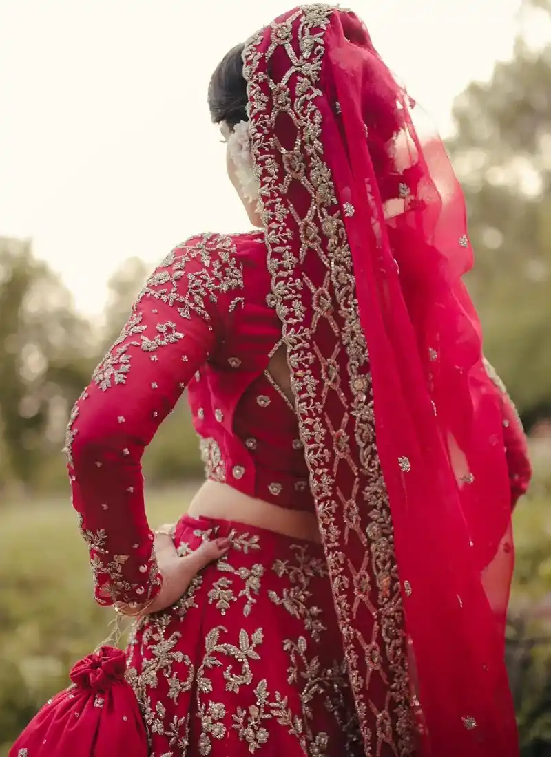 The rich pink colour bridal dress features a full sleeve blouse with a modern twist. The front neckline is a simple, rounded shape, while the back is shimmering with chic cutwork that adds an extra dose of modernity to the short top (Note: this area can be customized and covered as per customer requirements). The silver and light Sindhi-Gold embroidery has been crafted throughout the dress. It’s pure zardozi work along with crystal embellishments (such as sequins, pearls, etc).