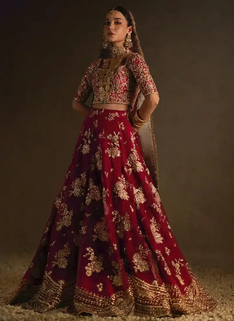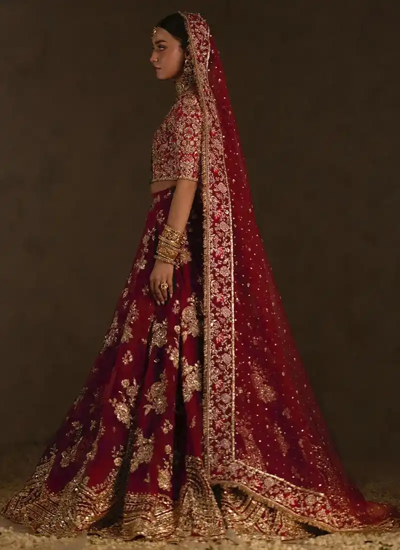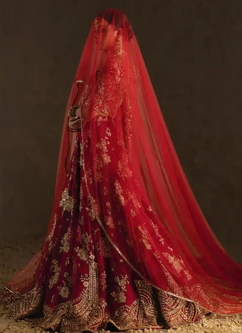 Looking for something uniquely stunning for your Walima, Nikkah, or Baraat day look in chic red colour? Look no further than this Red Indian Bridal lehenga choli, featuring a contemporary, breathtaking design for young desi brides in the USA. The deep bridal couture is one of our best-selling lehengas this wedding season. The flowy traditional attire incorporates rich, luxurious fabrics such as tissue silk and organza, with incredible zari detailing that makes this one of the hottest outfits and prettiest lehengas ever. Scroll down if you want to know the complete details of this trendy creation.
